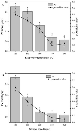 PV decreased with increasing evaporation temperature and scraper speed. For example, as the evaporation temperature and scraper speed increased from 120 to 200 °C and from 180 to 260 rpm, respectively, PV decreased from 2.71 to 1.99 meqO2/kg (Figure 2A) and 3.81 to 2.09 meqO2/kg (Figure 2B), respectively. The initial reduction of PV was attributed to the decomposition of the thermally unstable lipid hydroperoxide, which is the initial oxidation product of oil [29]. Since low-molecular-weight secondary oxides are distilled as the light phase, the p-anisidine value of soybean oil behaved similarly to PV as the evaporation temperature increased from 120 to 180 °C, whereas an increase of p-anisidine value was observed as the evaporation temperature further increased from 180 to 200 °C. This behavior was similar to that previously reported for other vegetable oils and was ascribed to the degradation of traces of natural bioactive substances, which generated some small molecules including aldehyde, ketone, acid, such as 2-alkenal, 2,4-adienal, and hence increased the p-anisidine value [16]. Since high distillation temperatures are believed to facilitate the loss of natural micronutrients from soybean oil, the distillation temperature of 180 °C was concluded to be suitable for practical application.