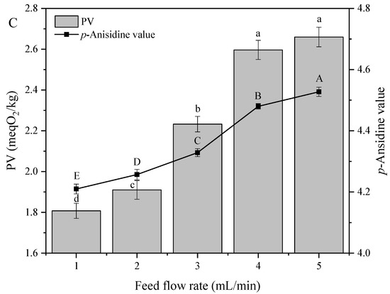 Effect of (A) evaporation temperature, (B) scraper speed, and (C) feed flow rate on the peroxide (PV) and p-anisidine values of soybean oil. Note: The lowercase letters of a-d indicate that there are significant differences in peroxide value under different treatment conditions; the capital letters of A–E indicate that there were significant differences in p-anisidine value under different treatment conditions.