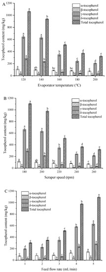 Effect of (A) evaporation temperature, (B) scraper speed, and (C) feed flow rate on the tocopherol contents of soybean oil. Note: Different letters indicate significant differences between the same groups (p < 0.05).