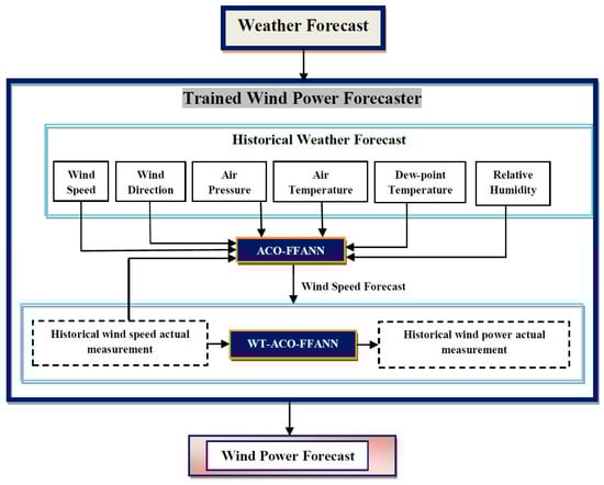 The devised WPP technique is based on the integration of WT, ACO, and FFANN. The WT is employed to extract the most important and healthy time subseries (data elements) from the target variable (wind power) original data time series. That means WT is applied in this paper to expand the initial target data into subseries. Using the target data subseries instead of the original data series increases the forecast accuracy of the devised WPP method. Therefore, the target data subseries is employed as the training target for the FFANN model at the second stage. That means the second stage FFANN models the existing affiliation between the wind speed actual measurement data at the farm spot and the wind generation actual measurement data subseries (obtained from the WT decomposition), while the first stage FFANN models the existing affiliation between the weather variables and the actual wind speed measurement.