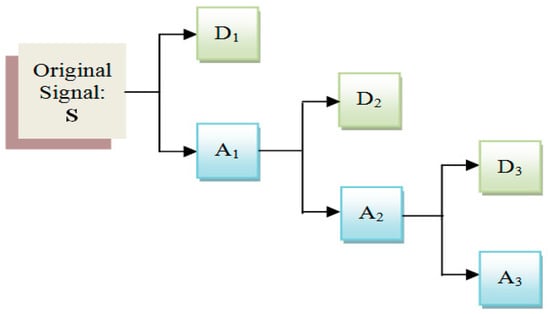 Mallat et al. [28] developed a very quick and efficient D-WT algorithm relying on the four fundamental filter types. Multi-resolution using the Mallat decomposition and reconstruction techniques is a way to obtain “approximation” and “detail” components of a particular signal. Through sequential decomposition of the approximation, a multistep ranked decomposition is achieved. That means the initial given signal is decomposed to reduced resolution sub-signals. Figure 2 shows the flowchart of the multistep WT decomposition process.