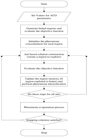 ACO is a class of AI-based metaheuristic optimization algorithms established based on the behavior of colonies of biological ants [32]. Artificial ants are the simulating agents that trace the best solutions through the exploration of a parameter domain consisting of all possible solutions. Biological ants excrete pheromones communicating with each other for food when discovering their surroundings. The artificial ants in ACO likewise save their locations and the excellence of their solutions; thus, in future search steps, additional ants discover improved solutions [33].