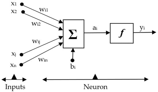 In Figure 5, the xs are the inputs to the ith neuron, yi is the result, wij is a connecting weight, bi is a bias quantity (usually constant), and fi is called the activation function. The activation function carries out a major task during the FFANN model training. It controls the behavior of the neurons’ output. Based on Figure 5, the FFANN neuron output can be formulated as follows.