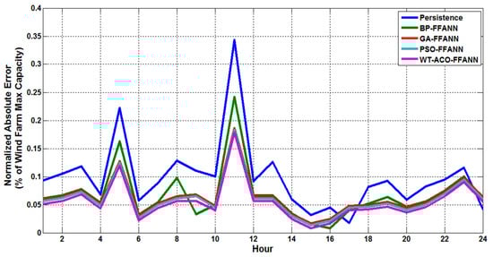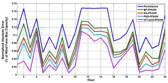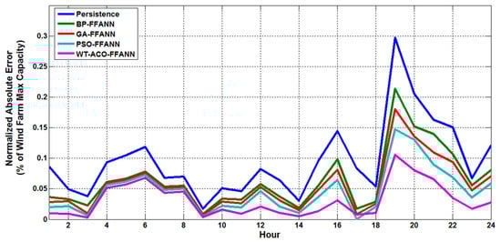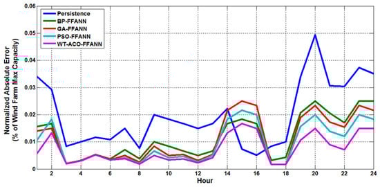 As presented in Table 6, the average variance of the forecast error achieved by the devised WT-ACO-FFANN WPP method is the smallest one, revealing the lowest variability of forecasts. The devised method’s average error variance improvements over the other four methods are 75.44%, 57.58%, 39.13%, and 30%, respectively.