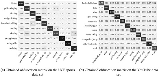 From the obfuscation matrix in Figure 3 we saw that in the UCF sports data set, because there were some similarities between "skating" and "walking" actions, some "skating" actions were recognized as "walking" actions, so there was a false recognition rate of 0.13 between them. In the YouTube dataset, because of the instability of samples and the complexity of background, it was difficult to identify the dataset itself. A high false recognition rate was seen with "basketball shoot" because, compared to other actions, this action was more complex and was composed of multiple actions, so it was very difficult to identify.