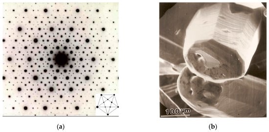 Albeit the Al-Mn alloy discovered by Shechtman was thermodynamically unstable, transforming into a periodic crystal phase upon heat treatment, the existence of thermodynamically-stable QCs was subsequently reported in the Al-Li-Cu and Zn-Mg-Ga alloy systems in 1986 and 1987, respectively [7,8]. Currently, more than sixty different QC compounds, belonging to about twenty different alloy systems, have been reported to be thermodynamically-stable up to their respective melting points and to display Bragg reflections of extraordinary quality (Figure 1a), comparable to those observed for the best monocrystalline samples ever grown [4,5,9].