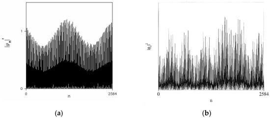 Two examples of different kinds of critical wave functions in one-dimensional Fibonacci QCs: (a) Electronic charge distribution for an extended state with E = −13/50 = −0.26 and a transmission coefficient T = 1 (reprinted from Maciá-Barber E. Aperiodic Structures in Condensed Matter: Fundamentals and Applications; CRC Press: Boca Raton, FL, 2009. With permission from CRC Taylor & Francis group); (b) electronic charge distribution for a low diffusivity state with E = −0.335440… and a transmission coefficient T = 0.4689…