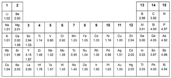 A long-term study aimed at calculating the electron per atom ratio, e/a, in structurally-complex metallic alloys was undertaken by Mizutani and co-workers, who have shown that this magnitude plays a key role in the cohesion of diverse classes of solids and it is closely linked with the more usual valence concept. To this end, they exploited the so-called full-potential linearized augmented plane wave (FLAPW)-Fourier theory in order to study the electronic structure of many pseudogap-bearing binary and ternary intermetallic compounds, including Al-, Zn-, and Cd-based compounds, Zintl polar compounds, phosphorus-based compounds, and inter-transition metal compounds. In this way, reliable e/a values for 54 elements in the periodic table were obtained, including representatives from group 1 up to group 15 (Figure 4) [28]. Thus, the origin of a pseudogap at the Fermi level for a large number of materials has been successfully interpreted in terms of electronic interference conditions, regardless of the bond-types involved.
