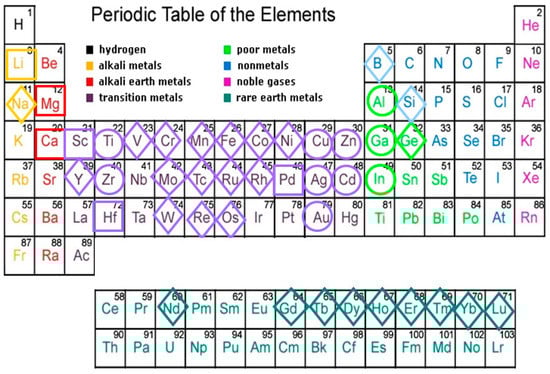 Chemical elements found in thermodynamically-stable QC alloys. Main forming elements (Al, Ga, In, Ti, Zr, Zn, Cd, Cu, Ag, and Au) are circled. The second major constituents are squared. Minor constituents are framed within a diamond.