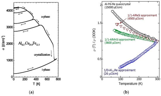 (a) Temperature dependence of the electrical conductivity of an AlCuFe thin film for different annealing states for the amorphous and for the i-QC phase. The conductivity progressively decreases when the long-range order quality is improved (spanning over more than one order of magnitude at low temperatures) and a clear inverse Matthiessen rule is observed in the σ(T) curves. (Reprinted from Haberken, R.; Khedhri, K.; Madel, C.; Häussler, P. Electronic transport properties of quasicrystalline thin films. Mater. Sci. Eng. A 2000, 294-296, 475-480. Copyright (2000), with permission from Elsevier); (b) temperature dependence of the electrical resistivity of a i-AlPdRe QC along with 1/1-AlReSi, 1/1-AlMnSi, and 1/0-Al12Re approximants. The low-temperature electrical resistivity values are indicated in the graph. (Reprinted from Takagiwa, Y.; Kirihara, K. Metallic-covalent bonding conversion and thermoelectric properties of Al-based icosahedral quasicrystals and approximants. Sci. Technol. Adv. Mater. 2014, 15, 044802; doi:10.1088/1468-6996/15/4/044802, Creative Commons Atribution-NonCommercial-ShareAlike 3.0 License).