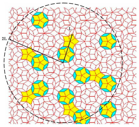At this stage it is convenient to highlight that the self-similar symmetry characteristic of fully-fledged QCs has the important effect of reproducing the same local patterns once and again at different spatial scales, thereby relaxing the very notion of “local scale”. In the mathematical literature this property is referred to as local isomorphism and its significant role in interference processes can be described in terms of the so-called Conway’s theorem, which states that distances between identical local arrangements of atoms scale with their own characteristic size [45]. That is, any finite-size region reappears once and again in a non-periodic fashion, but always having slightly different surroundings. Thus, the notion of repetitiveness, typical of periodic arrangements, should be replaced by that of local isomorphism, which expresses the occurrence of any bounded region of the structure infinitely often across the whole volume. In the particular cases of Fibonacci chain and Penrose tiling, Conway’s theorem states that given any local pattern having a certain characteristic length, L, at least one identical pattern can be found within a distance of 2L, as it is illustrated in Figure 7.