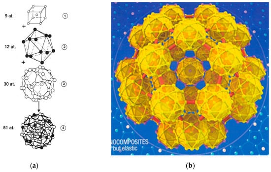 As it deduced from X-ray and neutron diffraction data the structure of i-AlPdMn and i-AlCuFe QCs is based on the so-called pseudo-Mackay cluster, which contains 51 atoms and can be described in terms of three centrosymmetric atomic shells: A core of nine atoms, an intermediate icosahedron of 12 atoms, and an external icosidodecahedron of 30 atoms (Figure 8a) [46,47,48,49]. The structures of stable i-QCs in the AlCuLi, ZnMgZr, ZnMgRE, ZnMg(Al,Ga) and MgAlPd systems were grouped in the MgAlZn class, which is based on the so-called Bergman clusters: The center is vacant, the first shell is an Al/Zn icosahedron, the second shell is a Mg dodecahedron, and the third shell is a larger Al/Zn icosahedron. Finally, stable i-QCs found in the binary Cd(Yb,Ca) and the ternary ZnScM, (Ag,Au)In(Yb,Ca), and CdMgRE alloy systems have been grouped in the CdYb Tsai-cluster third class, which constitutes the largest of the three classes of i-QCs. In the core of each Tsai-type cluster there is a tetrahedron created by four positionally-disordered Cd atoms, the first shell is a Cd dodecahedron, the second shell is a Yb icosahedron, and the third shell is a Cd icosidodecahedron [50,51].