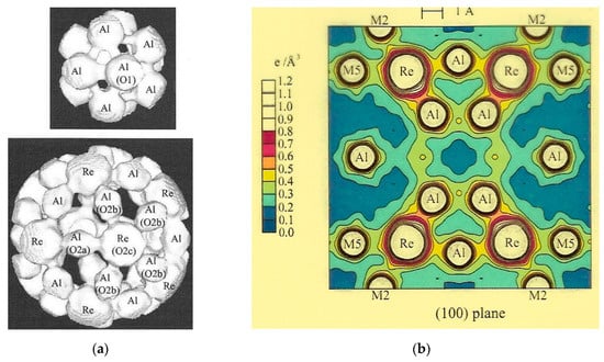 (a) Electronic charge equidensity surfaces (0.35 e/Å3) of the Mackay icosahedral cluster first (top panel) and second (bottom panel) shells in the α-AlReSi approximant crystal; (b) section contour map of charge density of α-AlReSi in the range 0.00–1.20 e/Å3, with a step of 0.10 e/Å3. (Reprinted figure with permission from Kirihara, K.; Nakata, T.; Kimura, K.; Kato, K.; Takata, M.; Kubota, Y.; Nishibori, E.; Sakata, M. Covalent bonds and their crucial effects on pseudogap formation in α-Al(Mn,Re)Si icosahedral quasicrystalline approximant. Phys. Rev. B 2003, 68, 014205 Copyright (2003) by the American Physical Society).