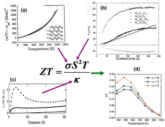 Collage picture illustrating the contribution of each transport coefficient (magenta arrows) to the resulting ZT value (green arrow). Note that panels (a–d) correspond to different i-QCs representatives, each one showing an optimal behavior for the considered physical magnitude: (a) Temperature dependence of the electrical conductivity for four different i-QCs up to 1000 K. (Reprinted figure with permission from Mayou, D.; Berger, C.; Cyrot-Lackmann, F.; Klein, T.; Lanco, P. Evidence for unconventional electronic transport in quasicrystals. Phys. Rev. Lett. 1993, 70, 3915-3918. Copyright (1993) by the American Physical Society); (b) temperature dependence of the Seebeck coefficient for different i-QCs. (Courtesy of Roberto Escudero); (c) temperature dependence of the thermal conductivity for the i-Al74.6Re17.4Si₈ QC (solid line) and its 1/1-cubic approximant (dashed line). The contribution due to the electrons (estimated from the Wiedemann–Franz law, dotted line) is almost negligible as compared to that due to the phonons (Courtesy Tsunehiro Takeuchi); (d) figure of merit (ZT) curves as a function of temperature for Al71−xGaxPd20Mn9 (x = 0, 2, 3). (Reprinted from Takagiwa, Y.; Kirihara, K. Metallic-covalent bonding conversion and thermoelectric properties of Al-based icosahedral quasicrystals and approximants. Sci. Technol. Adv. Mater. 2014, 15, 044802; doi:10.1088/1468-6996/15/4/044802, Creative Commons Atribution-NonCommercial-ShareAlike 3.0 License).