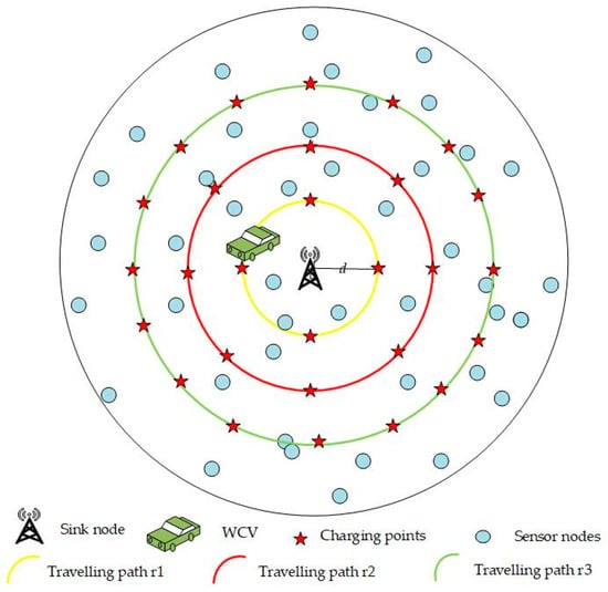 As shown in Figure 1, we consider a network with sink node, a WCV and n nodes that are labeled as . Nodes are randomly deployed within a circular area of diameter L, and are responsible for sensing and transmitting data to the sink node. The WCV sends wireless signals to nodes through energy transmitting module, and nodes’ energy receiving module transforms them into energy. The whole sensing region is divided into different concentric static rings around the sink node. Here, the circumferences with different diameters represent charging paths, and the WCV will stop at the charging points on these paths to charge the nodes in its charging radius of . Moreover, the radius of circumference closest to the sink node is d, and each radius of other circumferences increases by d. For the convenience of expression, we marked the charging path of away from sink node as .