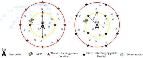 The sum of charging time at each charging points is fixed, which is recorded as the charge cycle . After each charge cycle, the angle formed by a new position of charging point to sink node and the last position of charging point to sink node is . Here, it should be noted that the charging points turn back to original position after every nc cycles later. For example, when , the position before and after turning is shown in Figure 2. And can be expressed as:
