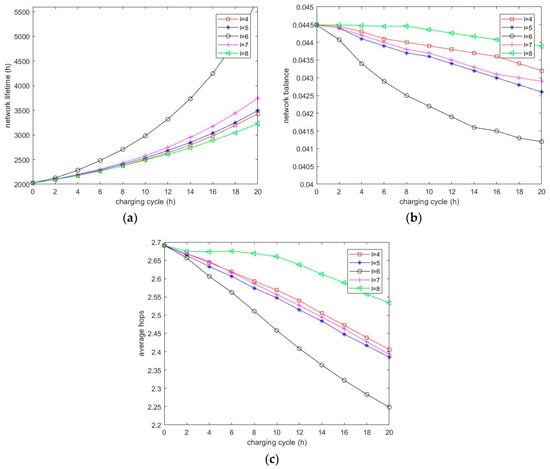 In order to analyze the impact of the charging duration on the network performance, the network size was set to 200, the charging cycle was changed from 0 to 20 with step size of 2 and the number of charging points on was 4v, 5v, 6v, 7v, 8v. Figure 3a,b and c are the graphs of network time, network balance and average hops under different charging cycle , respectively.