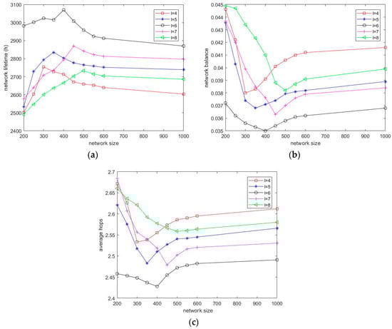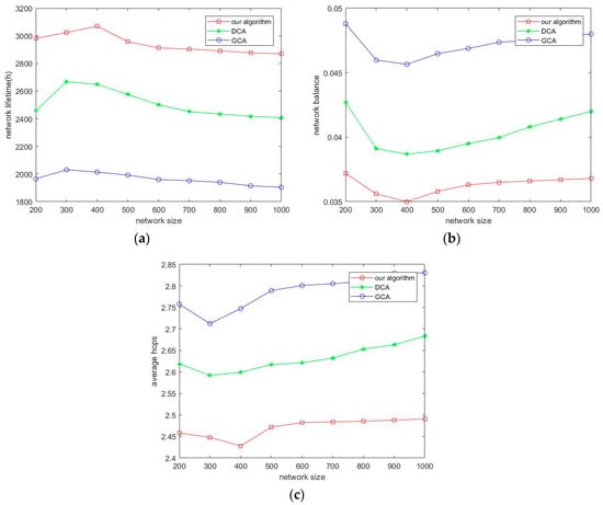 (a) Network lifetime versus network size; (b) network balance versus network size; (c) average hops versus network size.