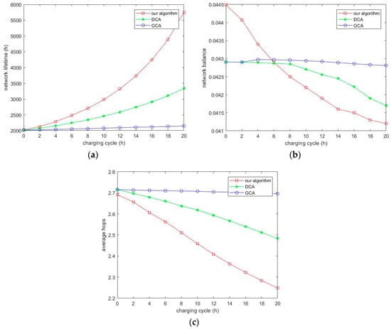 (a) Network lifetime over charging cycle; (b) network balance over charging cycle; (c) average hops over charging cycle.