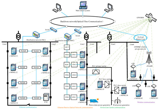 In conclusion, in addition to improving the processing capabilities of hardware devices, the communication protocol should also be re-optimized [26]. Figure 1 shows the distribution network WAMS organizational structure, which can share the communication network with the existing distribution terminal. Substations communicate with the power distribution main station via the backbone communication network, and the backbone network is based on Synchronous Digital Hierarchy/Multi-Service Transfer Platform (SDH/MSTP). The communications between the distribution line uMPMUs and substation PDCs are located at the access layer. There are a variety of communication methods, including Ethernet and passive optical networks based on fiber-optic communication, and wireless private networks based on 4G LTE 230MHz. Individual isolated points can also consider the use of Orthogonal Frequency Division Multiplexing (OFDM)-based broadband power line carrier communication.
