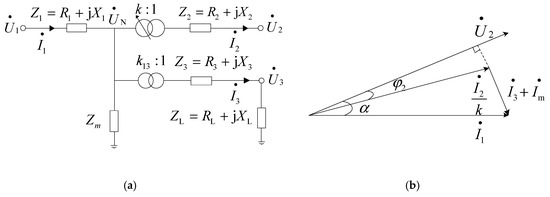 Power transmission is performed by the high-voltage side and the medium-voltage side of the three-winding transformer, and reactive power compensation is done by the low-voltage side. Its equivalent circuit and phasor relationship are shown in Figure 2. Z1, Z2, and Z3 represent the impedances of the high-voltage, medium-voltage, and low-voltage side windings, respectively, Zm is the excitation impedance, represents the angle between and , represents the angle between and . Approximately, the angle between the excitation current and the low-voltage side winding current and is 90°, so that the calculation formula of the three-winding transformation ratio can be obtained: