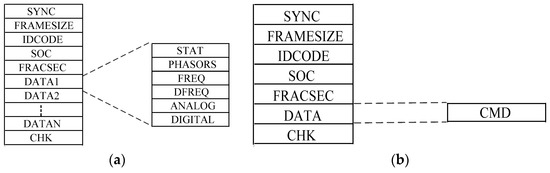 The data frame structure and the command frame structure of GB/T 26865.2-2011 are shown in Figure 3. The data frame sent by the PMU contains only one data section DATA, which stores its own measured data, and the data frame sent by the PDC contains the number of DATA segments equal to the number of PMUs connected to it. The DATA segment contains bit-mapped flags STAT, phasor estimates PHASORS, frequency offset FREQ, frequency change rate DFREQ, ANALOG, and DIGITAL. It does not state whether there is a change in digital quantities or whether the analog quantity requires time synchronization. All data are sent together. The command frame is sent by the main station, PDC, and PMU. It only contains one DATA segment and stores the command word CMD. CMD is 2 bytes in length, where Bits 12~4 are reserved. It refers to DLT 1402-2015 “Technical specification for application of synchronous phasor in power plant and substation” to supplement the reserved 9 bits; define Bits 05~04 as 01 points and 10 points; define Bits 07~06 as 01 selection, 10 Execute, and 11 cancel; and define the last remaining Bits 12~08 as the information object address. The 5-bit binary number represents up to 31 digital quantities. For a single μMPMU, 31 digital quantities are sufficient, but one distribution network PDC can connect up to more than 20 μMPMUs. In remote control, the PDC should match each remote control number of each μMPMU to the corresponding unique remote control number of the main station, and 31 is far from meeting the mapping requirements, so this extension is not applicable on the μMPMU.