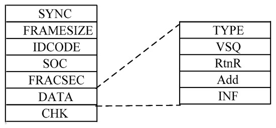 GB/T26865.2-2011 [30]: 2011 version of real-time dynamic monitoring systems of power system-Part 2: Protocols for data transferring. This specifies the data transmission protocol of the real-time dynamic monitoring system of the power system, including real-time data transmission and offline data transmission. Suitable for real-time data transmission and historical file transfer between the main station and sub-station. A previous study [31] introduced the development of the version of the Synchronous Phasor Transmission Protocol, and another compared GB/T 26865.2-2011 with IEEE C37.118.2-2011 [32]. Their definitions in real-time data transmission are basically the same. The analysis and extension of GB/T 26865.2-2011 can be easily used by IEEE C37.118.2-2011.