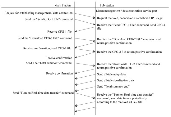 After the application extension frame is added, the startup process of the communication between the sub-station and the primary station needs to increase the total summoning session. All telesignalization and telemetry data of the sub-station are uploaded by the total summoning, and the real-time data transmission is started after the total summoning is completed, and the startup process ends. The communication startup process is shown in Figure 5. It should be noted that the main station and PDC/μMPMU, PDC, and μMPMU can all form the relationship between the main station and sub-station.