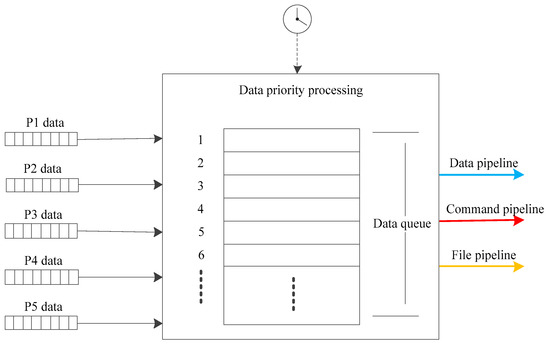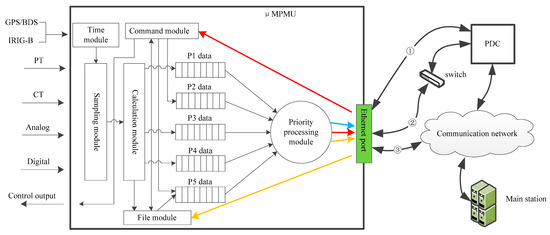 Figure 7 shows the μMPMU model with the multi-priority data processing model designed according to the proposed method. The real μMPMU internal modules and other communication networks and devices are abstracted, focusing only on the method implementation. The blue line is the data pipeline and is responsible for transmitting P1 data. The red line is the command pipeline, which is responsible for transmitting the downlink management and control commands, configuration files, and uplink P2, P3, P4, and partial P5 data. The orange line is the file pipeline, which is responsible for transmitting the downstream file command and the upstream part of the P5 data. Path ① indicates that the μMPMU and the PDC are directly connected through the network cable. Path ② indicates that the μMPMU is connected to the PDC through the switch. Path ③ indicates that the μMPMU communicates directly with the primary station over the communication network.