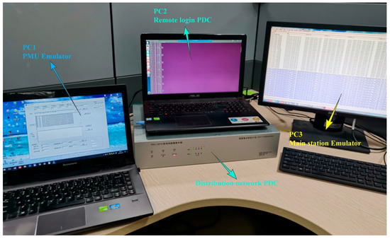 Figure 9. Experimental environment. - Distribution network PDC: PDC device hardware adopts platform hardware architecture design, a dual-core dual-thread CPU, Intel (R) Celeron (R) 2980 U, 2 M cache, clocked at 1.60 GHz; the hard disk adopts a Solid State Disk, with a capacity of 480 GB; the memory type is DDR3L, with a memory size of 4 GB; the time interface is RS-485, using IRIG-B timing; and it supports a dual power supply, which can be remotely logged in to through the network port or directly connected to the monitor. The system uses a Linux real-time multitasking operating system that is autonomously tailored. Software support standard GB/T 26865.2-2011 protocol and the extension method, using Socket multi-channel and multi-thread programming, through the select procedure, are employed to complete non-blocking mode communication. The data transfer rate is adjustable and the file is cyclically stored. It can connect no less than 20 μMPMUs, and is able to communicate with multiple primary stations, supporting high-latency PMU data aggregation and forwarding; that is, stable communication functions in a hybrid networking environment. The PC2 in Figure 9 is used to remotely log in to the PDC.