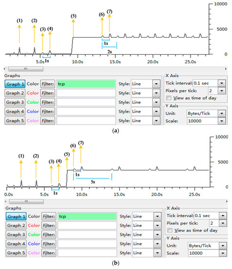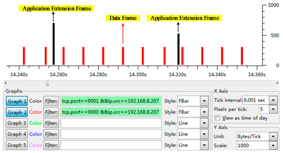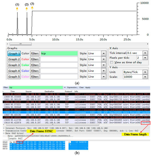 Figure 11a,b shows data traffic statistics, and the parameters of the coordinate system are the same as those of Figure 10a. Peak (1) shows the traffic generated by the CFG1 of the PDC actively summoned by the main station. Peak (2) depicts that the main station delivers the traffic generated by CFG2. In response to the total summon, Peak (3) indicates the traffic generated by the PDC uploading application extension frames with digital quantities. Peak (4) illustrates the traffic generated by the PDC uploading application extension frames with analog quantities. The interval between the two types of data is 1 s. Peak (5) indicates the traffic generated by the PDC uploading the data frame after the PDC starts the real-time data transmission. After the real-time data transmission is enabled, a command is issued to start the periodic transmission of application extension frames. The meanings of Peaks (6) and (7) are the same as Peak (3) and (4). As can be seen from (c), the data frame length is significantly lower than the standard protocol data frame length. The length of a single application extension frame is long, but the transmission period is long and has little effect on traffic. Application extension frame SYNC is 0xaa53. As can be seen in conjunction with Figure 10 and Figure 11, data traffic has been significantly reduced after the implementation of the extended protocol.