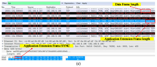 Extended protocol running result. (a) Communication data traffic when application extension frames delivery period is 2 s; (b) communication data traffic when application extension frames delivery period is 5 s; (c) application extension frames and data frames in extended protocol.