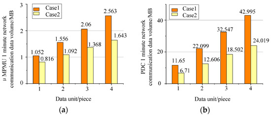 It can be seen from the calculation results shown in Figure 12 that the numerical value of Case 2 is smaller than the numerical value of Case 1 for a single μMPMU or PDC. As the amount of data units increases, the ratio between the value of Case 2 to the value of Case 1 decreases. The percentage in Figure 12a decreased from 77.57 to 64.1%, and the percentage in Figure 12b dropped from 57.6 to 55.86%, which further indicates the effectiveness of the proposed method in reducing the amount of network communication traffic.
