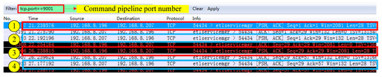 The IP of PC1 is 192.168.3.206. The IP of PC3 is 192.168.8.196. The PDC connects to the PC1 through the network port with the IP address of 192.168.3.207, and connects to the PC3 through the network port with the IP address of 192.168.8.207. The command pipeline port number is 9001, and the data pipeline port number is 9000. Network data is crawled by running Wireshark software on PC3 to help analyze communication processes, data, and traffic. Wireshark (formerly known as Ethereal) is a network packet analysis software. It is developed to provide the most detailed measurements of network packets and data. Wireshark uses Windows packet capture (WinPCAP) as an interface to send and receive data packets directly on the network card.