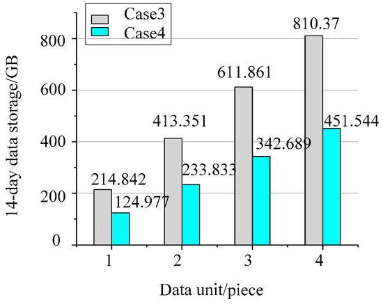 It can be seen from the calculated results shown in Figure 15 that the data generated from Case 2 are always smaller than Case 1 among different data unit ranges. As the number of data units increased from 1 to 4, Case 2 decreased from 58.17% of Case 1 to 55.72%, indicating the effectiveness of the method in reducing the amount of data stored.