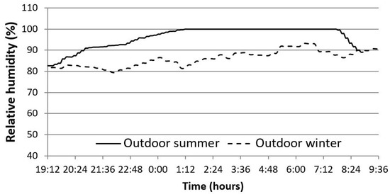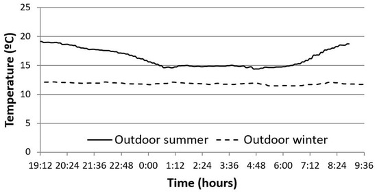 An interesting change in temperature from 20–15 °C during the unoccupied period of the summer season can be observed. As we can see in Figure 2, in summer weather the temperate remains constant from 0:00 until 7:00, but during the winter season a nearly constant 12 °C can be observed. This event is typical of the weather conditions that would help understand its effect over indoor ambiences.
