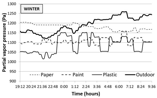 In accordance with the previous works performed in the summer season, for this climatic region, a more interesting period helps to appreciate the more intense effect of internal coverings. In this sense, we can appreciate that, during the winter (Figure 5), permeable coverings tended to exert an opposite effect on the outdoor conditions. In particular, the humidity cumulated and released from permeable materials is expected to be found in the first 4 h (from 19:30 to 11:30) and, after this, only permeable internal coverings will reduce partial vapor pressure more slowly than impermeable internal coverings. Additionally, the opposite effect was appreciated during the last hours of occupation in this season.