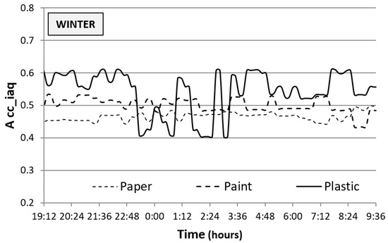 For the indoor partial vapor pressure prediction, more interesting thermodynamic variables and thermal comfort indexes were predicted. The moist air enthalpy, PDIAQ and ACCIAQ, was calculated for each season and for each internal covering during the unoccupied period from 19:00 to 09:00. Thus, partial vapor pressure, ACCIAQ, PDIAQ, and enthalphy were represented as the three most used materials for internal covering (paper, paint, and plastic) during the winter season in Figure 5, Figure 6, Figure 7 and Figure 8 and during the summer season in Figure 9, Figure 10, Figure 11 and Figure 12. Taking into account the permeability of these materials (Table 2) and the results obtained in previous works [1,2,3,4,5], based on a statistical study of indoor ambiences with these wall internal coverings, the following assumption is considered in the present study: Paper represents the permeable materials family, paint represents the semi-permeable materials family, and plastic represents the impermeable materials family.