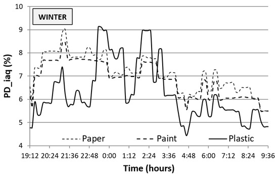 Indoor air percentage of dissatisfied persons (PDIAQ) predicted for each internal covering during the winter season.