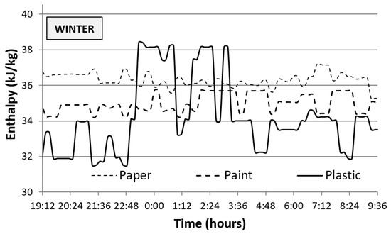 Indoor air enthalpy predicted for each internal covering during the winter season.