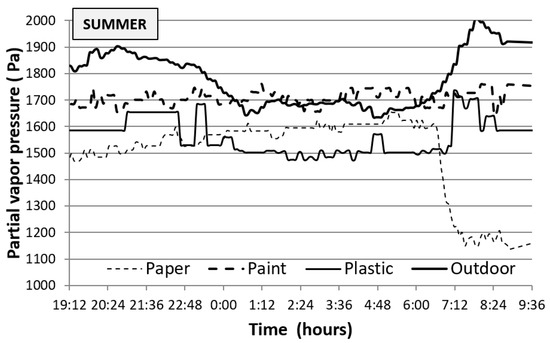 We can also see that, during the winter and summer seasons, the indoor ambiences of office buildings with impermeable internal coverings showed a tendency very similar to that of the outdoor ambiences. Finally, the office with semi-permeable materials tended to maintain a nearly constant partial vapor pressure during the night in both the seasons (cf. Figure 5 and Figure 9).
