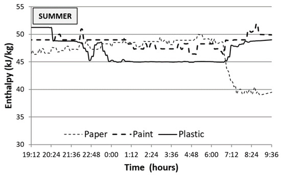 Indoor air enthalpy predicted for each internal covering during the summer season.