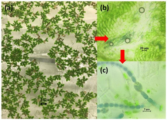 Azolla filiculoides L. (Salviniaceae) is a small (2.5 cm) heterosporous floating aquatic or semiaquatic pteridophyte occurring on the surface of eutrophic waters in temperate and tropical climate around the world (Figure 1a). It can exist either individually or in mats, which can reach a thickness of up to 20 cm. The fern has bilobed leaves. The dorsal lobe has an ovoid cavity inhabited by the community of cyanobacteria Anabaena azollae (Starsb.) (Figure 1b) capable of atmospheric nitrogen fixing using the nitrogenase enzyme (EC 1.18.6.1) in specialized thick-walled cells called hetrocysts (Figure 1c).