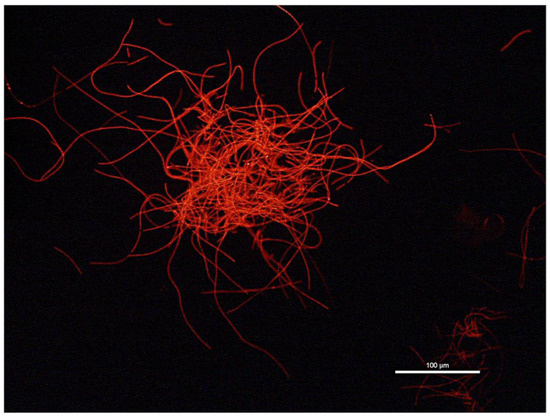 The isolation of the cyanobiont allowed us to observe the presence of dense agglomerations of cyanobiont filaments together with plant debris. After one week of cyanobiont culture, we collected sufficient amounts of living material for further studies; an example of the living culture is presented in Figure 2.