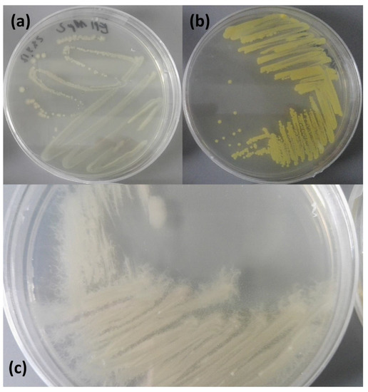 Examples of the most common isolates: (a) cream epiphyte, (b) yellow endophyte, and (c) white-cream filamentous form of epiphyte no. 37. Photo: A. Banach.
