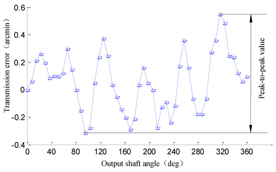 The transmission error of precision reducers is defined as the deviation between the actual output angle and the expected output angle of the output shaft and can be expressed as Equation (1) [2,3]. Figure 1 shows the transmission error curve and the peak-to-peak value is treated as the evaluation basis of the transmission precision of precision reduces.