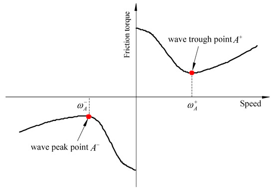 The friction torque of precision reducers decreases with the increase in the speed when the speed is low. The friction torque increases with the increase in the speed when the speed is greater than a certain value, showing a typical Stribeck effect (Figure 2) [10,11,12,13]. It can be seen that the forward and reverse Stribeck curves of precision reducers have a wave trough point and a wave peak point , respectively. Taking the forward curve as an example, when the speed , the friction torque of precision reducers decreases with the increase in speed. When the speed , the friction torque of precision reducers increases with the increase in the speed. When the speed , the precision reducer is subjected to the smallest friction torque. Therefore, the friction torque is the smallest when the speed , and this speed is the optimal speed for the forward transmission error measurement. Similarly, is the optimal speed for the reverse transmission error measurement.