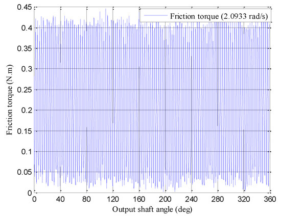 This section provides a concise and precise description of the experimental results, interpretation, and conclusions. In order to accurately obtain the Stribeck friction curve of the precision reducer, the friction torque measurement experiment was carried out under different speed conditions, from low speed to high speed. When the drive motor works in the speed mode, the speed fluctuation is very small and it can be approximately ignored. The friction torque of the precision reducer is equal to the drive torque of the motor at the input end, which is acquired by the torque sensor at the input end in real time. Figure 5 shows the variation of the friction torque with the meshing position under a speed of 2.0933 rad/s. In order to obtain the one-to-one corresponding relationship between the friction torque and speed, the mean value filtering method is used to deal with the measured data of friction torque under a steady speed [19]. In other words, the mean value of friction torque is used as the corresponding friction torque under steady speed. This method can also filter out the noise interference at the same time.