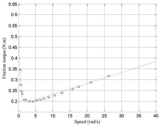 where and , respectively, indicate the forward and reverse friction torques; and , respectively, denote forward and reverse Coulomb friction torques; and , respectively, denote forward and reverse static friction torques; and , respectively, denotes forward and reverse Stribeck speeds; and, and , respectively, denote the forward and reverse viscous friction coefficients.