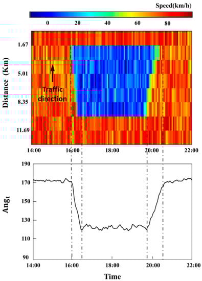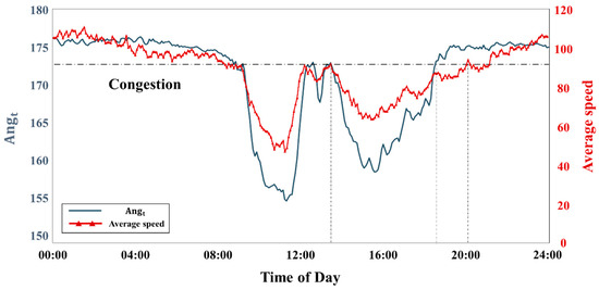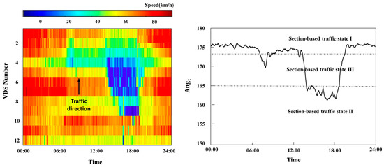 As described earlier, the PC was the linear combination of the variables and the first PC was the linear axis that held the largest variance. The direction of the first PC depended on a given data set, and the degree of its fluctuations/variations was less affected by the robust aspect of PCA [16]. This aspect was considered as one of the main advantages of the PC approach. The angle of the first PC was used to measure the SBTS of a group of the spatiotemporal speed data. The angle between the first PC and the standard vector, = [1, 1, 1, ...], at a time , was calculated by the following equation, where is the first PC.
